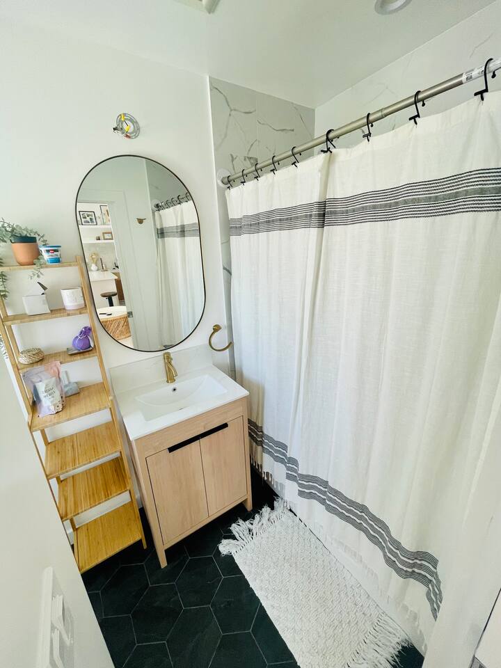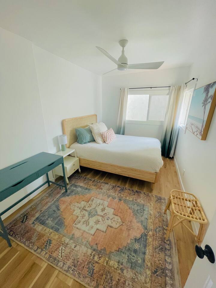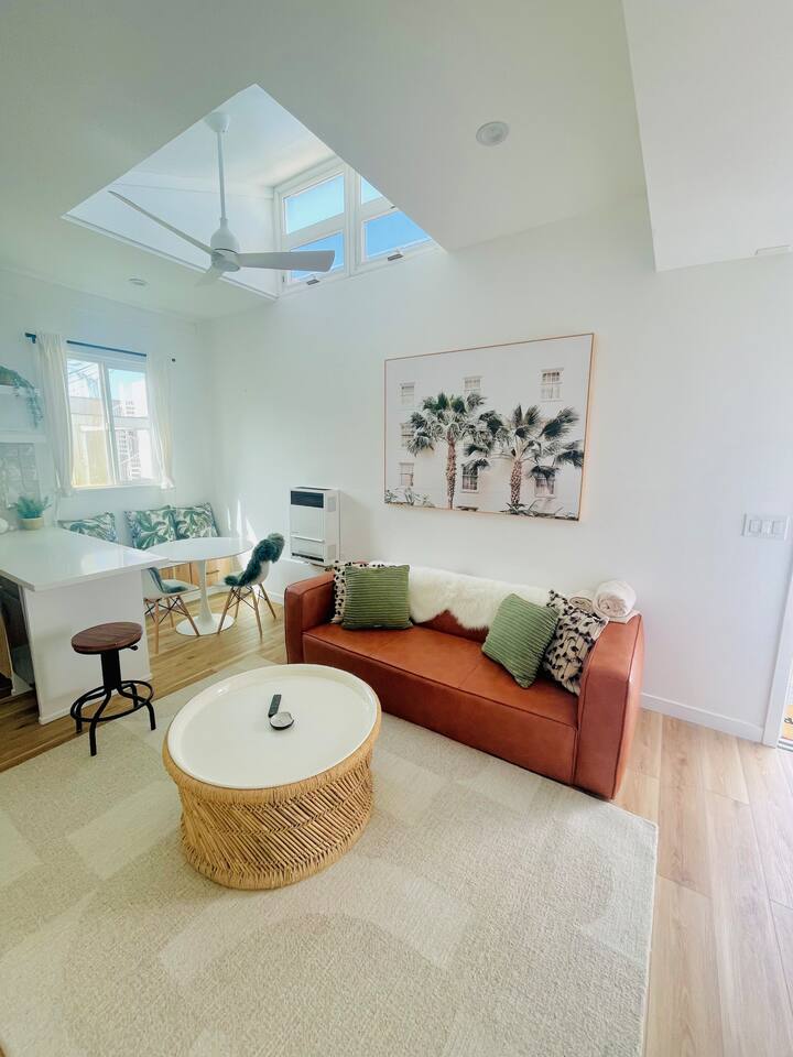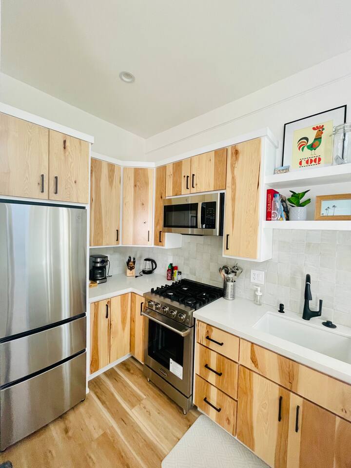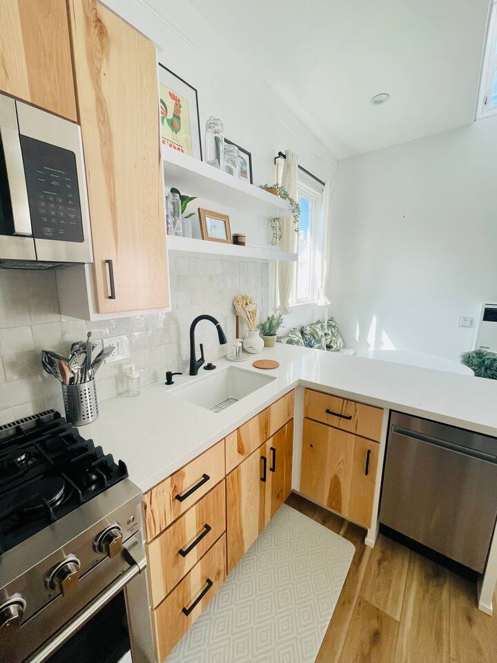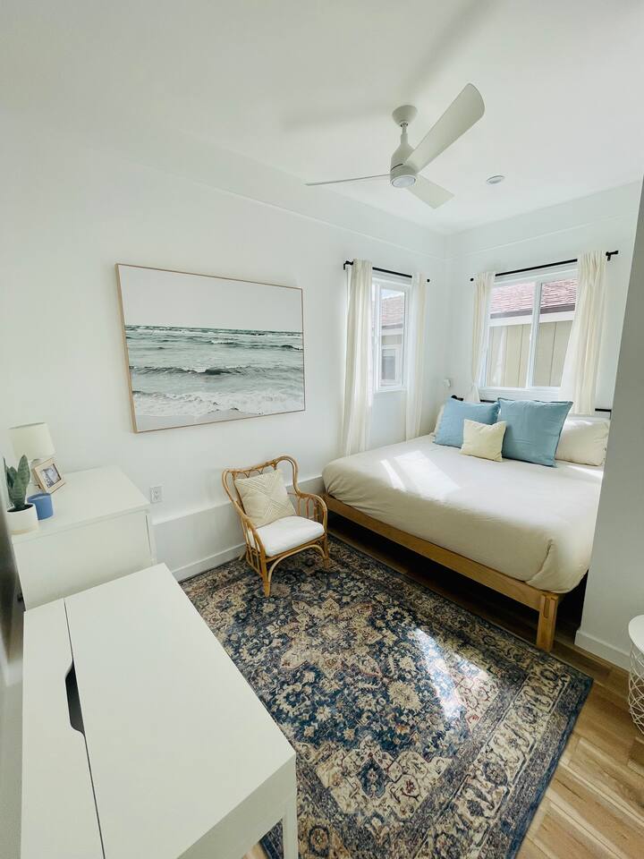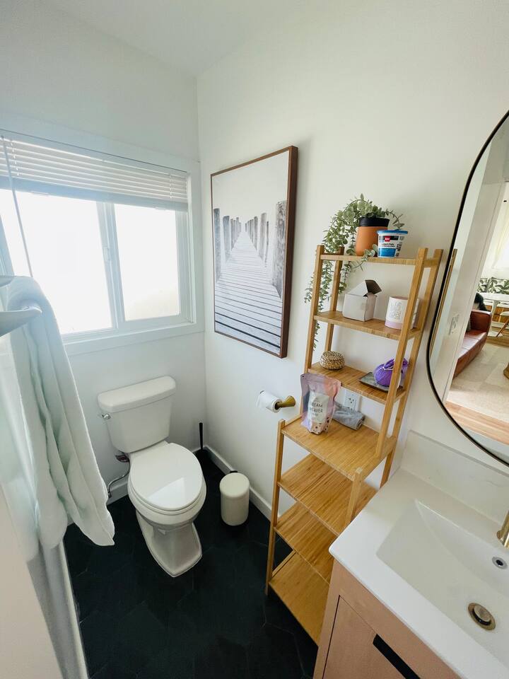the place has everything you need for a comfortable stay by the sea! - Bedroom 1 has a king sized bed with extra sheets and bedding, big windows that keep it airy and bright, large closet with additional storage above, desk and additional drawers and comfy chair for relaxing. - Bedroom 2 has a queen size bed with big windows looking down on the lower level patio, spacious floor space and a mirrored closet and desk area - kitchen: microwave, toaster, coffee machine, kettle, new fridge/freezer, dishwasher, stove, silverware, cooking sets, blender for the sunrise smoothie, and more! - bathroom: tub/shower combo, towels, hair dryer, shampoo, conditioner, body wash, ample storage - home office: desks in both bedrooms, fiber wifi, and lots of light! - living room: large connected tv with hbo, Netflix, etc, leather couch, many many bookshelves - laundry: in-unit washer dryer combo unit! - additional amenities: heater, iron, extra bedding, linen closet